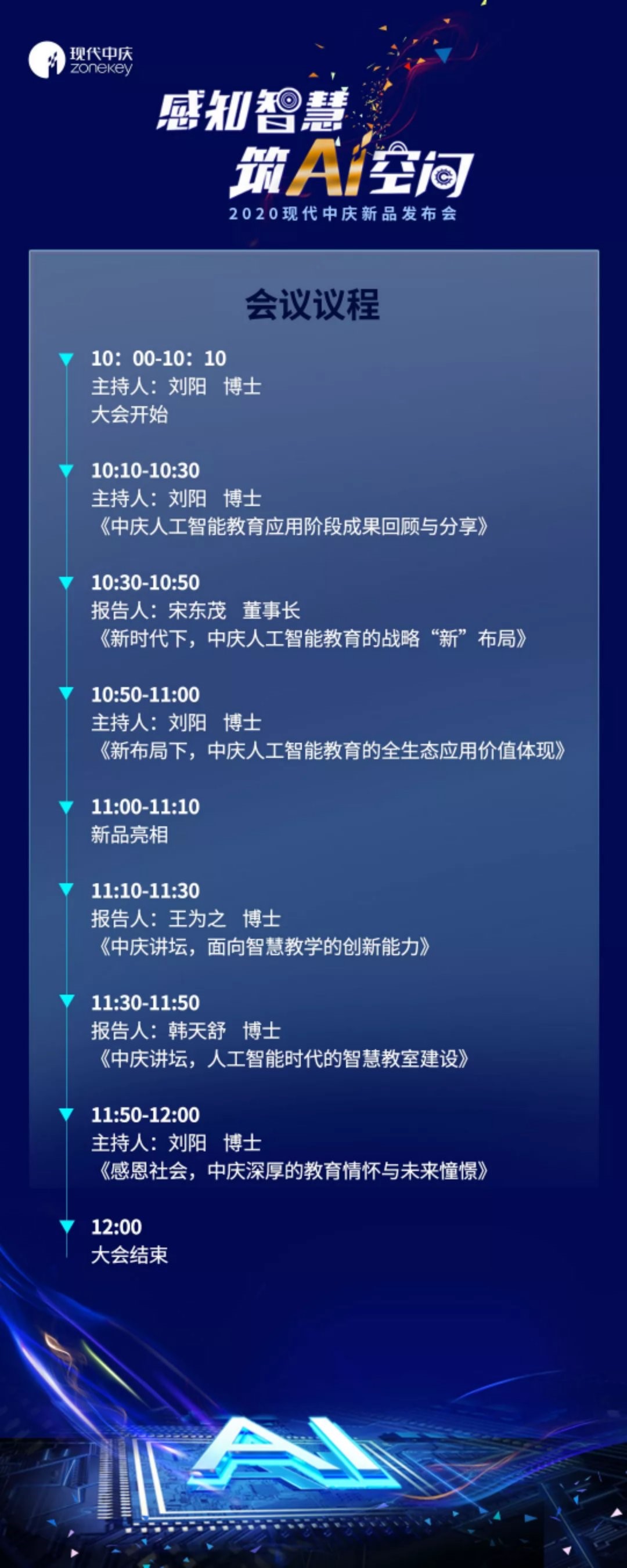2020年6月20日,中慶將正式面向教育用戶發(fā)布五款智能終端產(chǎn)品,全面開啟人工智能教育應(yīng)用的新篇章。“感受智慧,筑AI空間”2020現(xiàn)代中慶新品發(fā)布會(huì),誠邀您的光臨。