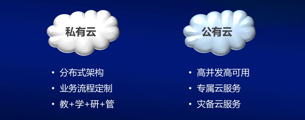 在大空間的架構(gòu)里,中慶所有的服務(wù)都基于云實(shí)現(xiàn),通過云打破了傳統(tǒng)空間的距離。中慶可以為用戶提供專屬化定制的私有云和公有云部署:私有云定位于教學(xué)流程的專項(xiàng)打造,公有云則為高并發(fā)、高可靠、高性能的應(yīng)用提供支持,例如點(diǎn)播、直播、互動(dòng)等。