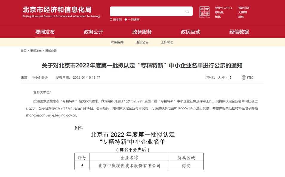 現代中慶入選北京市2022年度第一批“專精特新”中小企業