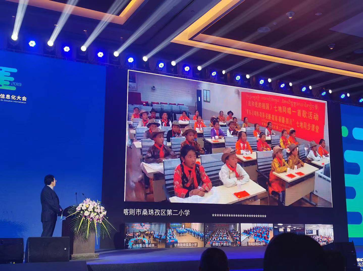 青島嘉峪關學校和西藏日喀則、貴州安順、甘肅隴南、四川大涼山、新疆建設兵團、山東菏澤等七地學生通過同步課堂“同唱一首歌”