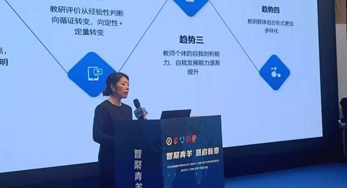 現代中慶高級講師劉芬,以《人工智能支持下的教研變革》為題,通過精彩的數據呈現,以及詳實的一線案例展示了數據驅動下的未來教師專業發展模式變革,以及教師成長支持體系的建設。