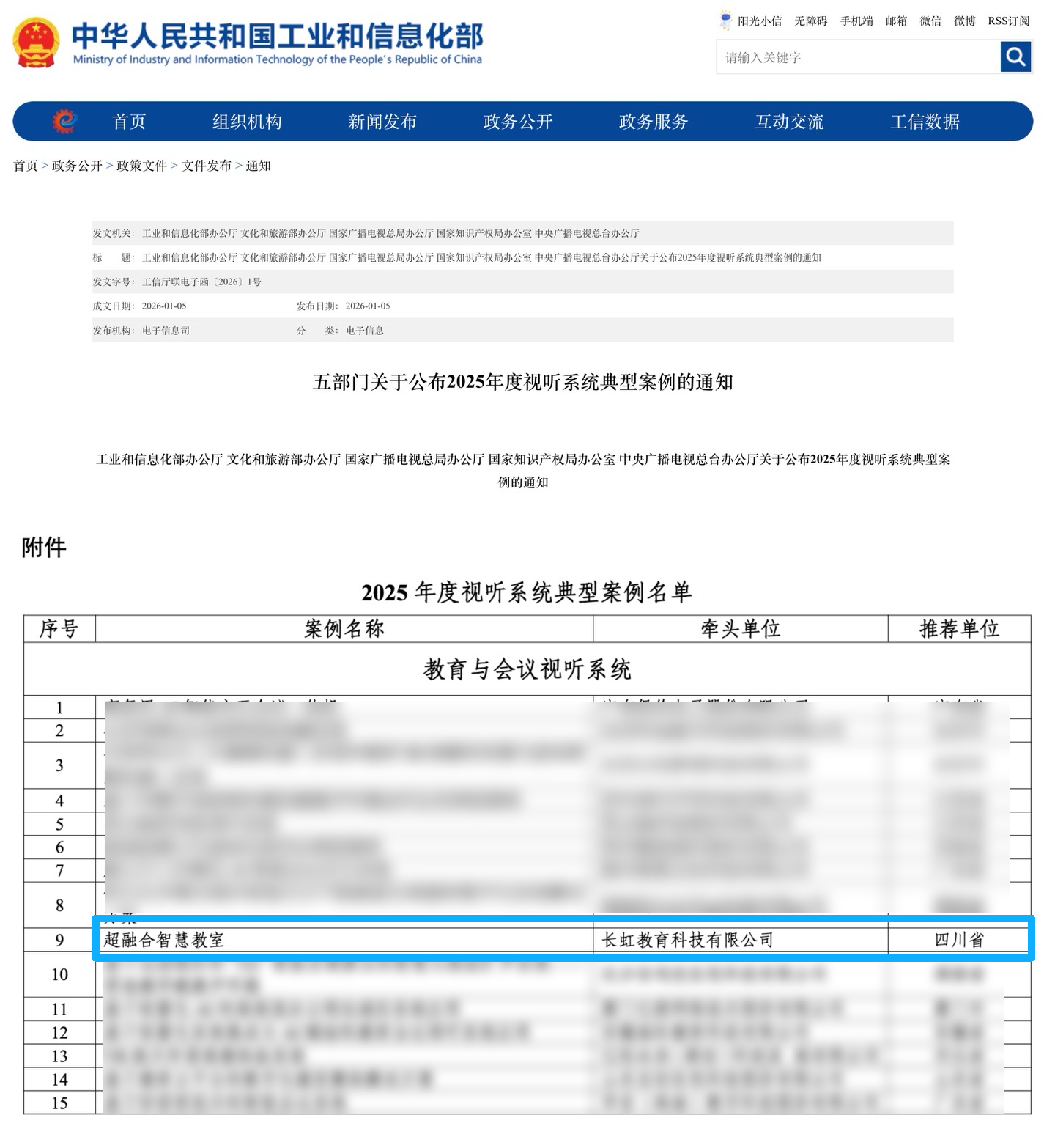 1月6日,工業和信息化部辦公廳、文化和旅游部辦公廳、國家廣播電視總局辦公廳、國家知識產權局辦公室、中央廣播電視總臺辦公廳五大權威部門聯合發布2025年度視聽系統典型案例名單。其中,四川長虹教育科技有限公司精心(以下簡稱“長虹教育科技”)打造的“超融合智慧教室”解決方案,憑借卓越的技術創新力與場景適配性,成功入選“教育視聽系統”方向典型案例,彰顯了長虹教育科技在數智教育領域的創新能力。