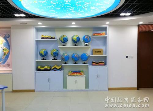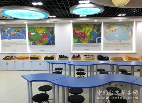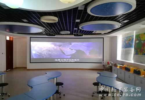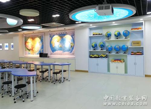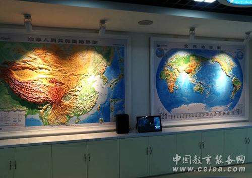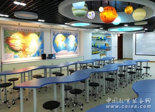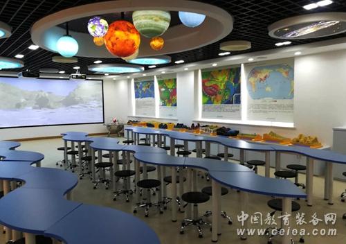 復興中學數(shù)字化地理專用教室占地140平方米,教室里配備了數(shù)字立體地形、環(huán)幕示教系統(tǒng)、地理實驗套裝、地形地貌模型等。在設計上豪華明朗又充滿科技感,與以往專用地理教室相比,教室吊頂層不僅有宇宙星空演示用的天文穹頂,還增加了懸掛式立體太陽系星球,在燈光的襯托下仿佛置身于其中,宇宙的無窮奧秘等著你去探索,這種情境式的教學環(huán)境能使學生快速進入學習地理的狀態(tài),提高課堂效率。
