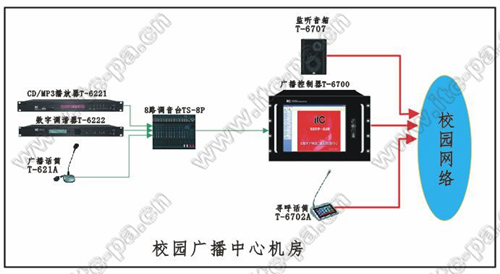 1. 在校園廣播室中放置了網絡控制主機、音源設備(CD/MP3機,話筒,卡座等)、有源監聽音箱等。