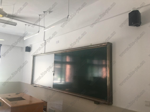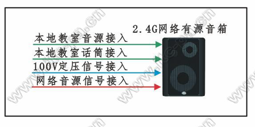 在教室中放置了2.4G網絡有源壁掛音箱(帶備份/MP3話筒),設備帶一路AUX輸入接口和一路MIC輸入接口(帶高低調節按鈕),可以接入本地話筒和本地音樂進行播放;設備帶100V定壓備份,可以在斷網之后,自動切換到輸入定壓信號,實現雙線路冗余。