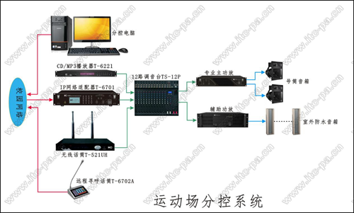 在運動場做了分控中心,分控中心機房配置12路調音臺、CD/MP3播放器、專業擴聲功放,遠程尋呼話筒,IP網絡適配器和分控電腦,運動場室外選用了號筒音箱(具有優良的中高音表現,聲壓級高,具有防水效果等)作為主擴音箱,防水音柱作為輔助擴聲音箱。
