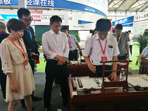 教育部關心下一代工作委員會常務副主任、中國教育裝備行業協會會長王富蒞臨展位,體驗智慧書法教室并給出高度評價。