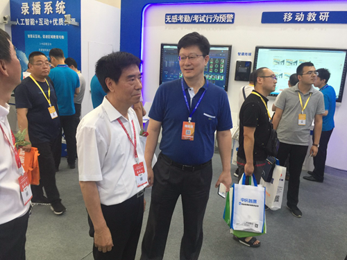 在中慶展位,中國教育裝備行業協會會長王富及相關領導蒞臨現場,北京中慶現代技術股份有限公司總經理周少林為其講解中慶教育大數據的應用流程,王富會長對中慶人工智能應用表示高度肯定并表示智慧教育的實質就是數據的智慧在不同環節中的應用。