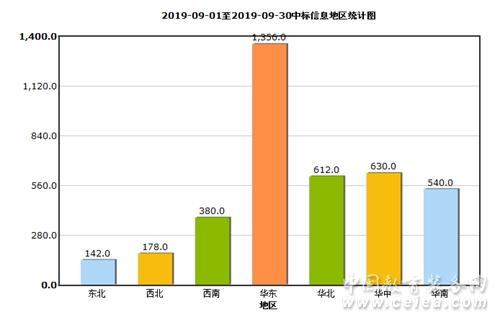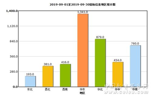 從9月中標(biāo)信息地區(qū)統(tǒng)計圖(如圖8所示)和全國中標(biāo)信息地區(qū)占比圖(如圖9所示)來看:華東地區(qū)中標(biāo)信息量為1356條,占比35%;華中地區(qū)中標(biāo)信息量為630條,占比16%;華北地區(qū)中標(biāo)信息量為612條,占比16%;華南地區(qū)中標(biāo)信息量為540條,占比14%;西南地區(qū)招中標(biāo)信息量為380條,占比10%;西北地區(qū)中標(biāo)信息量為178條,占比5%;東北地區(qū)中標(biāo)信息量為142條,占比4%。