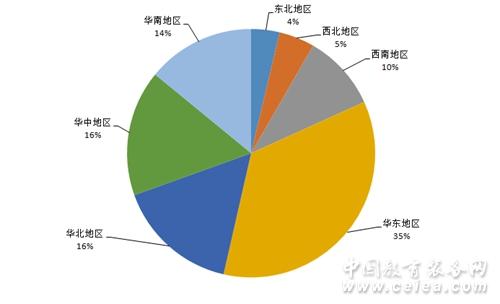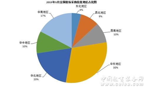 從9月招標(biāo)采購信息地區(qū)統(tǒng)計圖(如圖3所示)和全國招標(biāo)采購信息量地區(qū)占比圖(如圖4所示)可以看出:華東地區(qū)招標(biāo)采購信息量為1341條,占比30%;華北地區(qū)招標(biāo)采購信息量為879條,占比20%;華南地區(qū)招標(biāo)信息采購量為760條,占比17%;華中地區(qū)招標(biāo)采購信息量為454條,占比10%;西南地區(qū)招標(biāo)采購信息量為416條,占比10%;西北地區(qū)招標(biāo)采購信息量為381條,占比9%;東北地區(qū)招標(biāo)采購信息量為193條,占比4%。