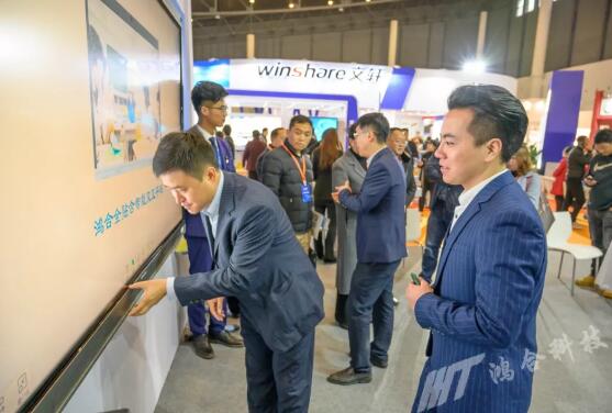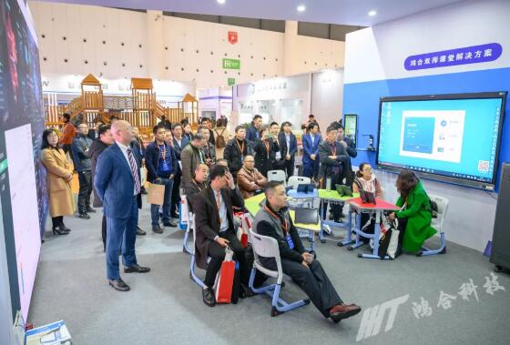 在本屆博覽會上,鴻合科技憑借長期服務教育行業(yè)信息化建設的深厚經(jīng)驗,在位于4A080展區(qū)以225平的展位面積,展出了包括鴻合智慧教室、雙師課堂、雙屏教學,校園數(shù)字媒體發(fā)布系統(tǒng)等面向不同應用場景的完整生態(tài)教育解決方案,以及鴻合智能交互黑板、智能交互平板、智能交互白板一體機、幼教交互白板、激光投影機、鴻合電子書包等一系列先進的智能交互硬件設備。除硬件設備及解決方案外,鴻合π交互教學軟件、鴻合愛學班班教師應用軟件也吸引了現(xiàn)場眾多參觀者駐足圍觀。