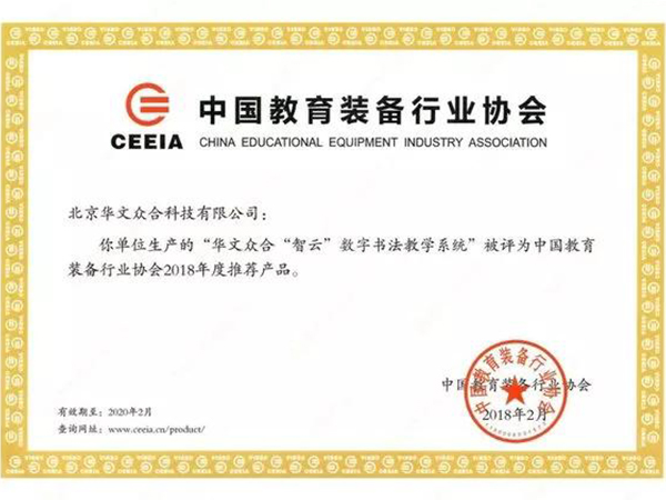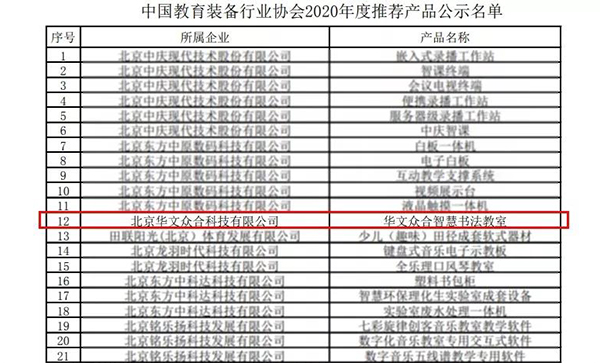 近日,中國教育裝備行業協會正式公示“2020年度推薦產品”。華文眾合智慧書法教室經過層層評審,成功入選。