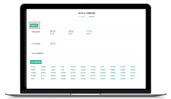 教師可按班級和日期查看課堂、預習、作業、輔導的統計分析數據,還可查看每個學生的答題情況。