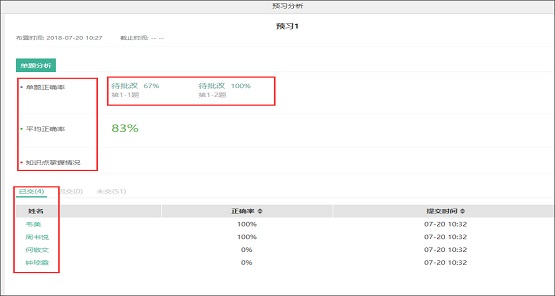 可查看該預習任務各題的正確率、批改情況、平均正確率、知識點掌握情況和已交、遲交以及未交的學生信息。