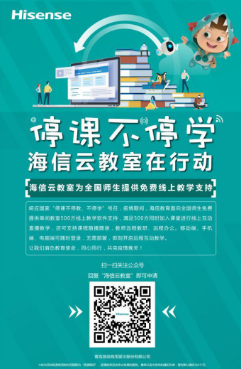 “停課不停學”是我們國家在疫情時期的濟急舉措,但同時亦是互聯網+教育類企業承擔社會責任、展現使命擔當的時刻。今日海信教育響應國家“停課不停學”的號召,即日起至疫情結束之日,海信教育為全國學校提供免費500方云教室解決方案,幫助學校與機構做到“停課不停學”。只需關注“海信商用顯示”公眾號,回復“海信云教室”進行注冊,審核通過后即可免費獲得500方海信云教室使用賬號。