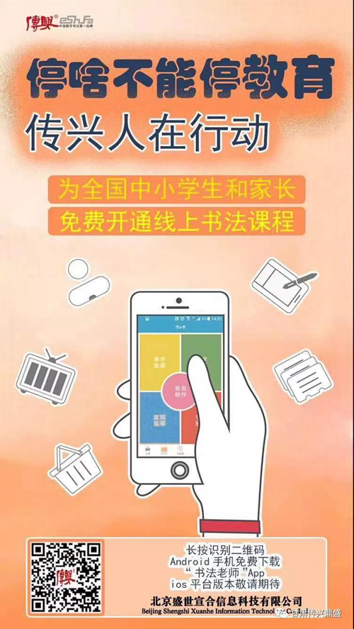 疫情期間,傳興書法提供“傳興書法老師APP”,讓書法老師、學(xué)生、書法愛好者隨時(shí)可跟著書法名家練習(xí),體會(huì)書法文化的博大精深和無窮魅力。