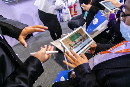 常態化智慧課堂展區的小組研討式新型研討方案引得人群紛紛聚集,參展嘉賓拿起希沃學生平板體驗,感受師生互動課堂的高效與便利。