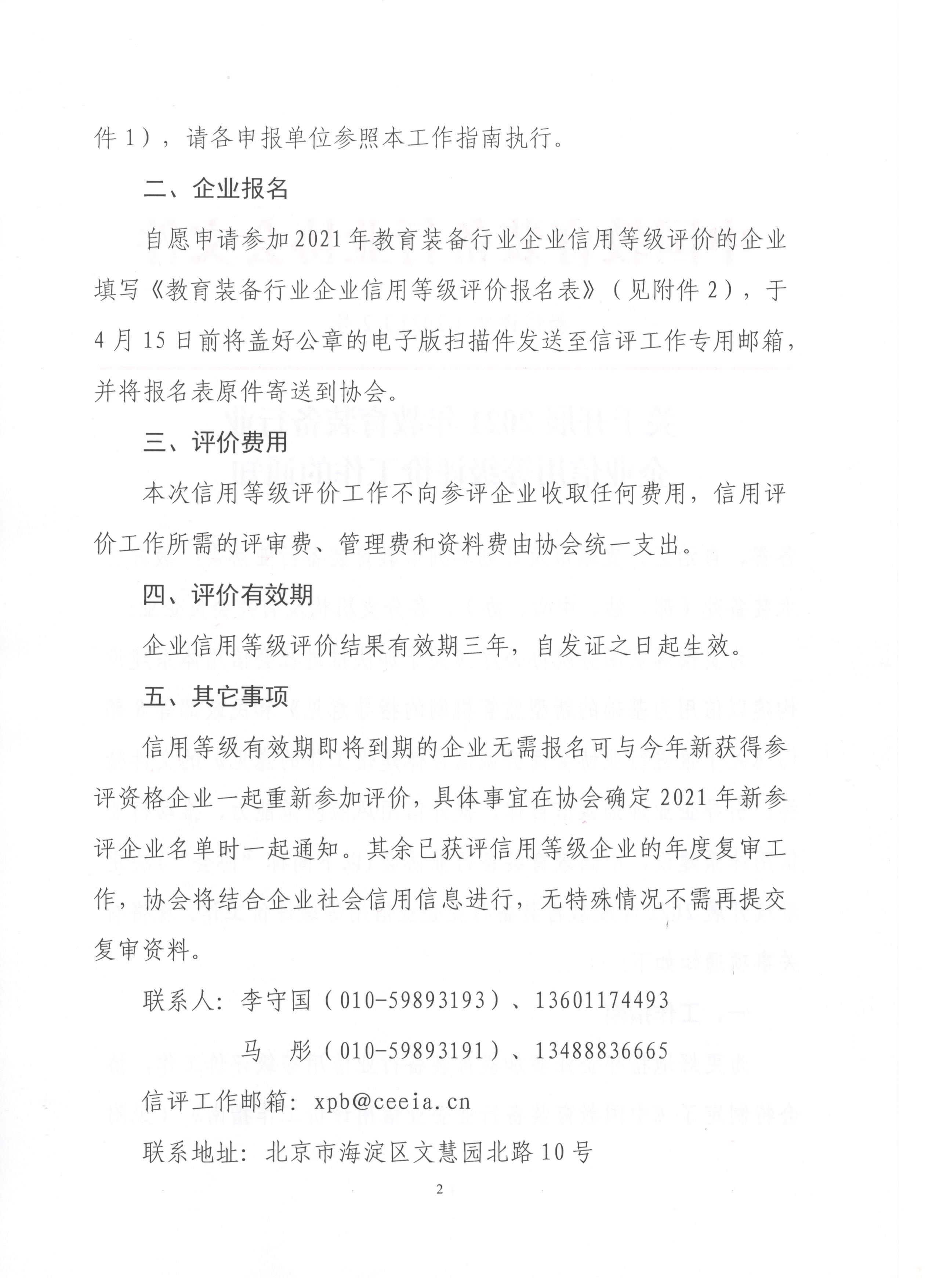 自愿申請參加2021年教育裝備行業(yè)企業(yè)信用等級評價的企業(yè)填寫《教育裝備行業(yè)企業(yè)信用等級評價報名表》(見附件2),于4月15日前將蓋好公章的電子版掃描件發(fā)送至信評工作專用郵箱,并將報名表原件寄送到協(xié)會。