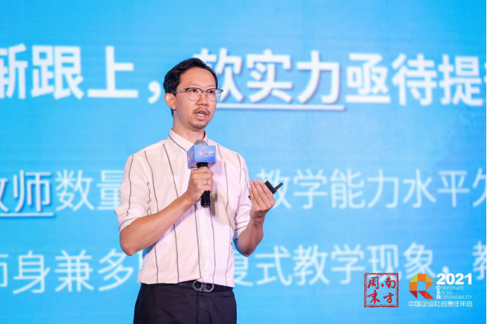 卓越教育集團CMO王啟旻也同樣看重教師在鄉村教育中的作用。他認為,鄉村教育的關鍵是要讓鄉村教師成長起來。為此,卓越教育啟動“護燭·鄉村教師關愛計劃”,將幫扶鄉村教師成長作為重要課題。他結合具體案例,講述了“護燭計劃”是如何以線上線下相結合的OMO模式來幫助鄉村教師,并分享了“互聯網雙師課堂”“5G+全息投影課”等將先進科技引入鄉村教學領域的創新性探索與成果,并表示未來卓越教育還將為鄉村支教教師打造能力可持續提升的OMO全年幫扶閉環。