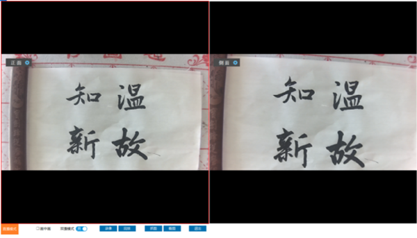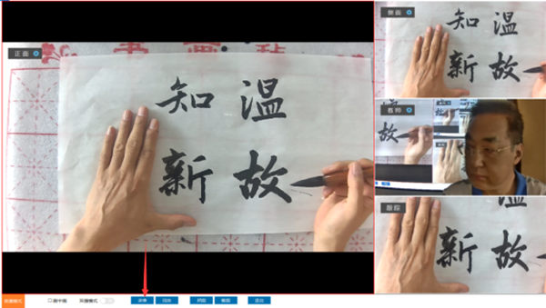 書畫教學展示臺由3臺攝相機組成,正面和側面攝像頭分別從正上方、左上方對書寫過程進行拍攝,特寫攝像頭正前方對教師授課進行怕拍攝,支持手動調焦。 |