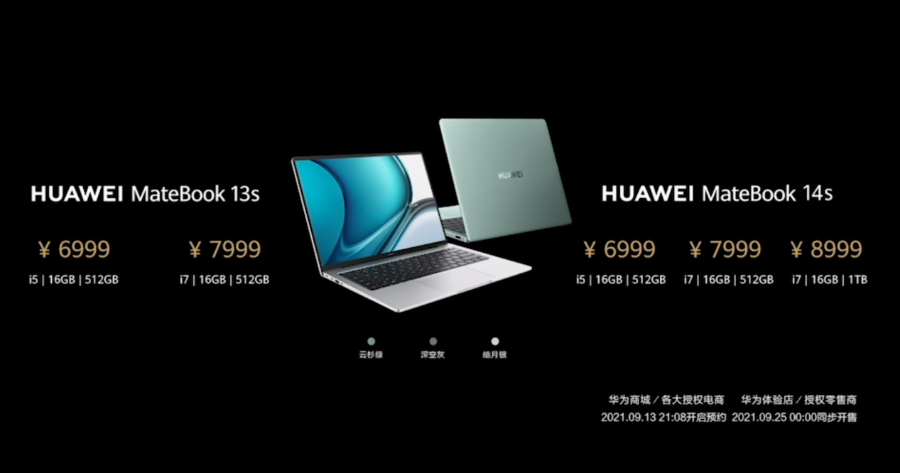 華為MateBook13s筆記本電腦i5/16GB/512GB版售價6999元,i7/16GB/512GB版售價7999元;華為MateBook 14s筆記本電腦i5/16GB/512GB版售價6999元,i7/16GB/512GB版售價7999元,i7/16GB/1TB版售價8999元。2021年9月13日21:08,華為MateBook 13s、MateBook 14s開始預約,9月25日0點正式開售。首銷當天兩款新品均享受直降100元優惠,購買華為MateBook 13s還贈華為dock2擴展塢。購買華為MateBook 13s、MateBook 14s的用戶9月25-10月13日完成曬單好評還有機會獲得華為藍牙鼠標。
