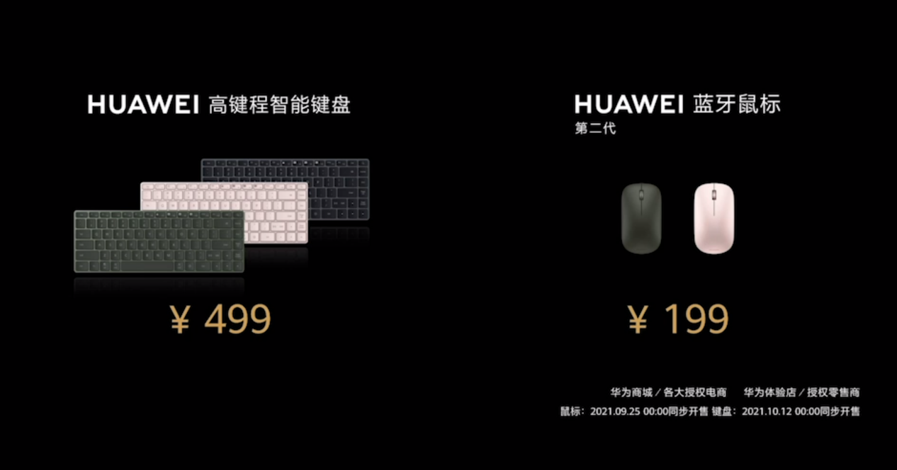第二代華為藍牙鼠標售價199元,2021年9月25日0點正式開售,首銷當天優惠20元。華為高鍵程智能鍵盤售價499元,9月13日21:08開啟預售,10月12日0點正式開售,首銷當天優惠50元。