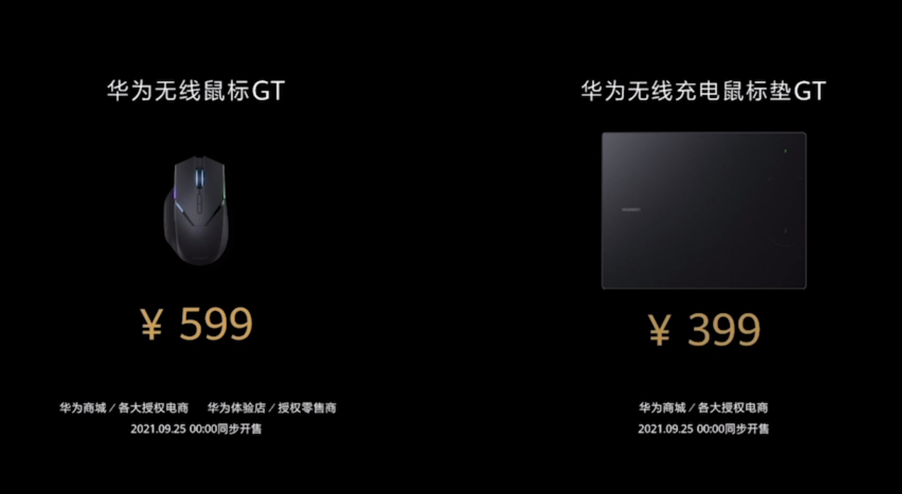 華為無線鼠標GT、華為無線充電鼠標墊GT,售價分別為599元、399元,2021年9月25日0點正式開售,其中華為無線鼠標GT首銷當天優惠50元。