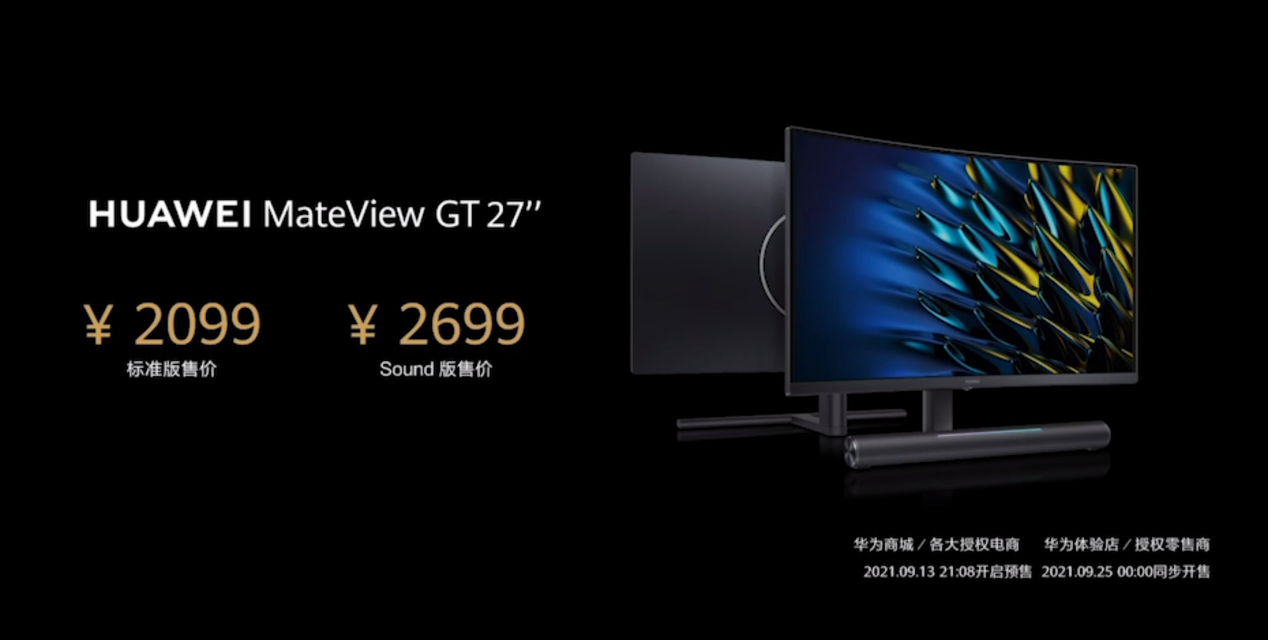 華為MateView GT 27英寸顯示器,標準版售價2099元,Sound版2699元,2021年9月13日21:08開啟預售,9月25日0點正式開售。首銷當天購買可享受100元優惠,曬單更有機會獲得華為拓展塢。