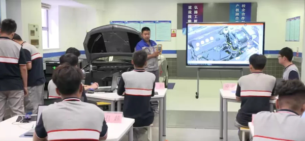 結合5G傳輸技術,教師的汽車維修操作畫面能夠通過終端實時投放至大屏上,一舉一動都能流暢展現,讓學生告別圍觀教學,加深對汽修技能操作的了解。