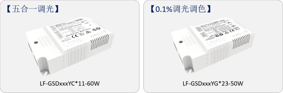 萊福德DALI家族適用于面板燈的電源產品,有DT6調光及DT8調光調色2大系列,其中DT6調光款LF-GSDxxxYC為DALI/Push/0-10V/PWM/Rx五合一調光,且可實現10臺電源僅占用1個DALI IP地址同步調光。