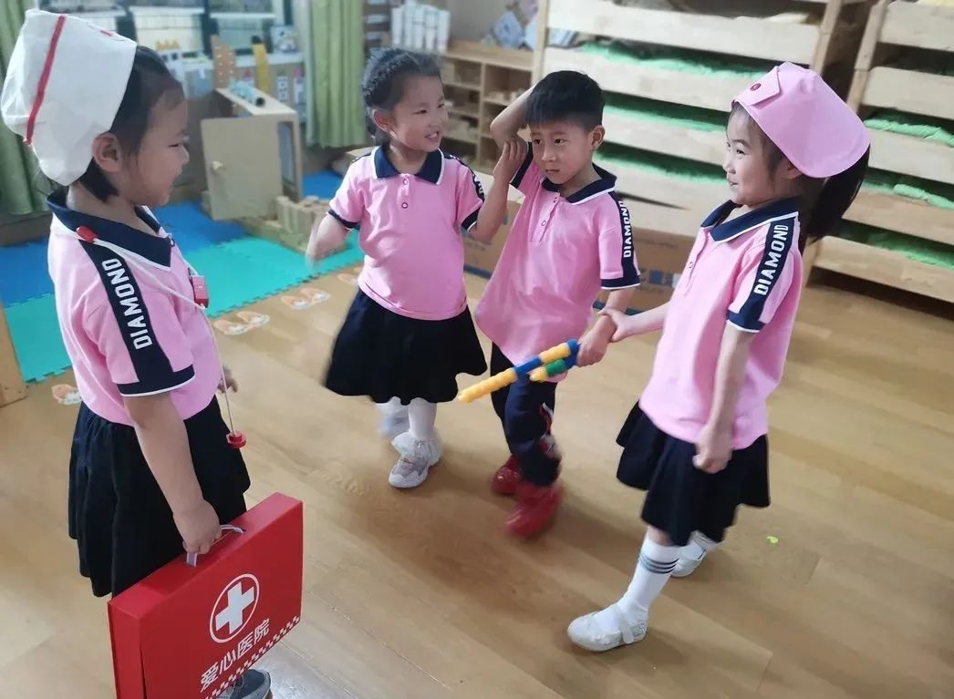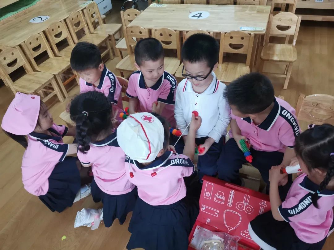 一瞬間,孩子們的興趣被調動起來。只見小醫生們快速拿上急救箱來到“戰場”,莫子涵大聲呼喊:“我們是醫生!誰受傷了?誰需要幫助?”