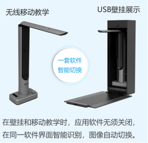 有線和無線雙模快速切換,可根據(jù)老師的教學場景,壁掛切換至移動桌面教學時,應用軟件也無須關閉,在同一界面中實現(xiàn)智能識別,自動切換影像畫面。