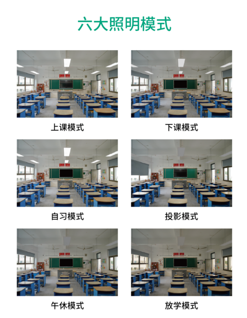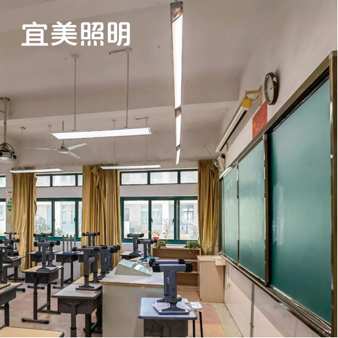 教室照明具有高照度、無眩光、無藍光、無可視頻閃和低UGR等要求,宜美照明以卓越的設計和選材,以及恒照度智能控光技術,提供六大照明模式,可為標準教室照明提供一系列解決方案。