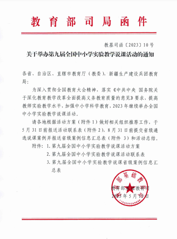 為深入貫徹全國教育大會精神,落實《中共中央 國務院關于深化教育教學改革全面提高義務教育質量的意見》要求,提高教師實驗教學水平,加強中小學科學教育,2023年繼續舉辦全國中小學實驗教學說課活動。