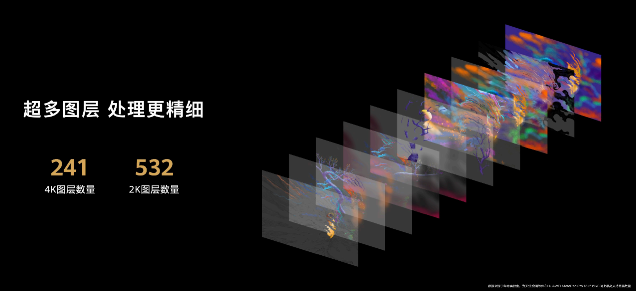 為天生會畫App打造的方天繪畫引擎,為用戶帶來極致流暢的使用體驗。方天繪畫引擎具備專業渲染、極速合成、高效存儲的強大能力,并通過軟硬芯整合的架構創新,可大幅優化性能負載,讓軟件運行更快,內存占用更低,實現更低時延、更多圖層和高幀率。華為MatePad Pro 13.2英寸(16GB)運行天生會畫,在2K畫布下可支持創建532個圖層,實現了行業領先。