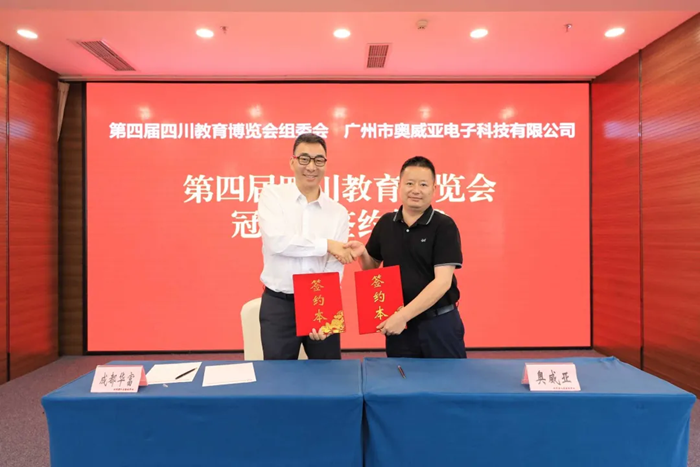 會議期間,第四屆四川教育博覽會組委會與廣州市奧威亞電子科技有限公司進行了冠名商簽約儀式。