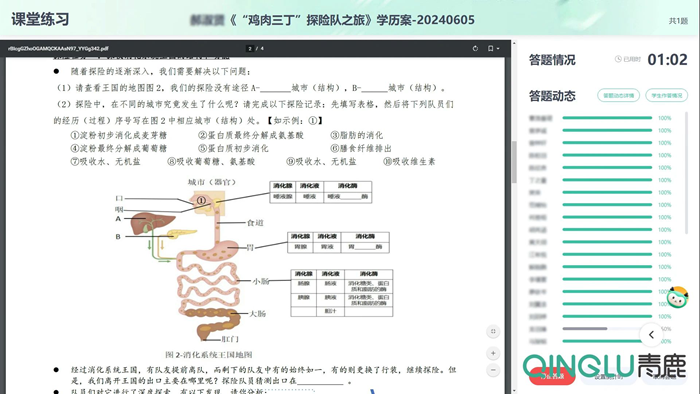 在《“雞肉三丁”探險隊之旅》一課上,郝老師通過布置學習任務, 讓每個學生在消化系統、血液循環系統、泌尿系統圖中用青鹿智能筆畫出營養物質的“探險路線”。