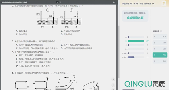 本節課圍繞重難點內容,張老師借助直觀的科學實驗視頻、圖片材料呈現相關知識,引導學生主動探究與互動分享,并結合實際生活案例讓學生借助所學知識達到問題解決的目標;在學習反饋方面,師生借助青鹿智慧紙筆系統完成知識檢測,且通過作答數據的即時分析與反饋,展開針對性講解并靈活調整課堂教學進度,有效提升了教學效率。