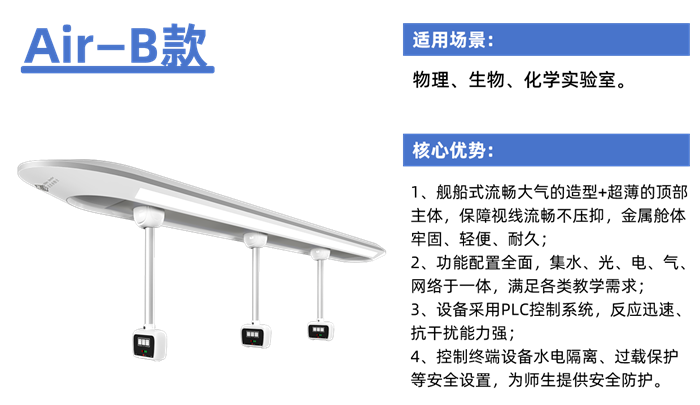 針對傳統實驗室地面管線復雜、空間利用率低的痛點,該系統在硬件上采用模塊化吊頂單元,集成水、電、氣、通風管道,搭配地面靈活布局,讓空間利用率提升40%;軟件平臺開發(fā)了智能化控制系統,教師端可一鍵控制設備啟停、環(huán)境調節(jié)和數據采集,兼容多終端交互;安全設計上,通過水電隔離和緊急斷電保護等功能,使事故率降低90%。
