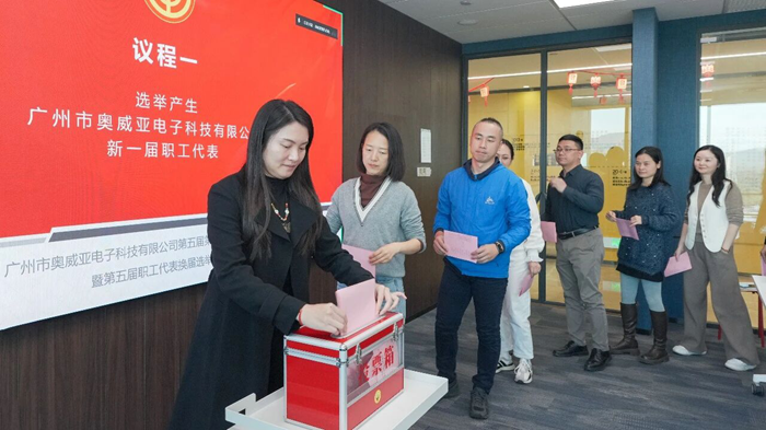 2026年1月8日下午,廣州市奧威亞電子科技有限公司工會第五屆第二次會員代表大會暨第五屆職工代表換屆選舉會議順利召開。公司黨總支副書記趙穎,副總經理、工會主席王洪軍出席會議并講話。