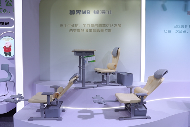 針對中小學生午休“趴睡”這一普遍痛點,富桂通展出的午休課桌椅成為了展館內的“明星產品”。該產品突破了傳統課桌椅的形態限制,通過精妙的人體工學設計與多角度調節機構,學生只需簡單操作,即可將課桌椅秒變為一張舒適的“午睡床”。配合其擁有專利技術的椅背與腳托設計,能有效貼合學生脊柱曲線,不僅解決了傳統趴睡導致的手麻、頸椎壓力大等問題,更是在展會現場引發了各地教育局采購負責人及校長的濃厚興趣與體驗熱潮。