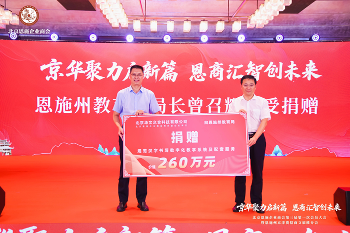 會上,大家共同見證了一場跨越山水的愛心傳遞——華文眾合董事長向大鳳代表公司向恩施州六縣二市100所中小學捐贈價值260萬元的“規范漢字書寫數字化教學系統”及配套服務,恩施州教育局黨組書記、局長曾召輝上臺接受捐贈。這份厚重的“教育禮包”,旨在運用科技力量,助力家鄉學子寫好中國字,傳承中華優秀傳統文化,推動教育均衡發展。