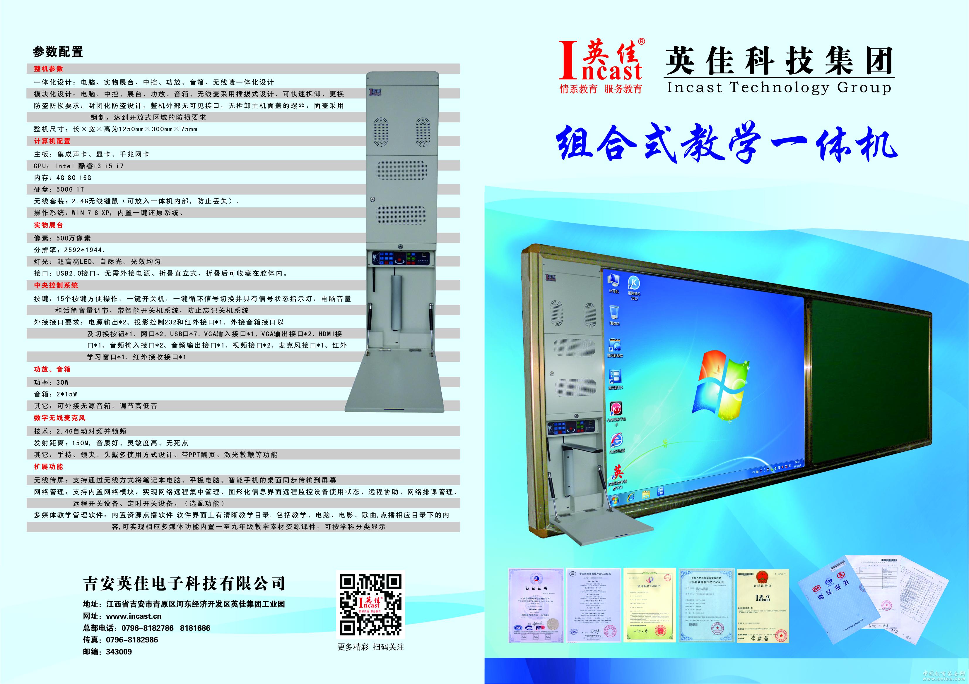 產品詳細介紹★1、壁掛式鋼結構設計,可嵌入到推拉黑板內,設備維護時無需拆除黑板,安全性高。內置計算機主機、高度集成2.4G多功能無線麥克風、高清錄播展臺、立體聲功放、高保真音箱,多媒體中央控制系統。 ★2、內置計算機參數配置:板載聲卡、顯卡、網卡,網卡速度1000M;CPU:intel四核2..0GHZ, 內存:4G, 硬盤:500G。USB接口;正版Windows操作系統,有支持VGA接口,具有RJ45網絡接口。 ★、整機配置:6路USB接口,白板USB獨立接口2路,采用USB放大器,增強型5V供電,使設備工作更加穩定,外接VGA:3*2路,支持外置筆記本VGA輸入,顯示器、投影機輸出。 4、外接視頻:1*1,DVD視頻輸入,1路視頻輸出投影機。 5、音頻接口:3*2路,內置PC輸入,外置筆記本輸入,DVD音頻輸入, 6、內置30W立體聲功放,可實現高音、低音調節,音箱根據要求內、外置。 7、紅外IR*2路;串口232*1路,可實現紅外和RX232控制投影機。 8、外置話筒接口輸入,可外接有線話筒,臺式話筒,無線麥克風。 9、2路RJ45網絡接口,1路可升級網絡中控控制,1路為NET網絡接口。 10、采用機械式按鍵控制面板,使用壽命可達1000萬次,可擴展紅外遙控控制。 ★11、中控采用“一鍵式”系統開關,操作方便,可升級網絡中控和IC卡排課系統。可擴展遙控控制一體機開關機及控制整機音量大�。� ★12、帶智能開關機功能,可設定不使用一段時間后自動關閉系統,防止忘記關機(現場演示)。 ★13、采用最新2.4G無線傳輸技術,雙天線接收,靈敏度高,抗干擾能力強無線麥克風,3.7V、1200MA聚合物鋰電池,手持、領夾、頭戴多功能設計。支持PPT翻頁,激光電子教鞭功能,具有話筒音量調節,靜音,電量指示,液晶屏顯示工作狀態。 14、采用高穩定開關穩壓電源供電,外置投影機電源,幕布電源供電接口,延時控制可精確至秒(軟件設置),開機發碼和延時關機及斷電功能,保證外接設備安全。 ★15、具備電腦開關機檢測功能,防止中控與電腦控制在相反的開關機狀態(現場演示) 16、內置實物展示裝置(或可擴展實物展示裝置)通過USB與計算機連接,500萬像素,分辨率:2592*1944,高清圖像拍攝,并支持錄像功能。配置液壓升降桿,加強展臺托盤承重力。 ★17、內置可擴展防盜報警系統,具有延時斷電功能。 18、隨機配備適合小學、初中、高中云資源教學平臺;通過互聯網下載使用,兼容XP、Win7等微軟操作系統。內置資源管理軟件,可對教學課件進行有效管理,實現課件的存儲、播放,點播軟件界面設計目錄索引,可對教學資源庫,系統可操作軟件集中化管理,支持目前各種主流格式文件、圖片、音視頻等多媒體資源。 ★19、生產企業通過ISO9001國際質量管理體系認證,ISO40001環境認證,計ISO18001企業安全管理認證證書,計算機軟件著作權證書,多媒體一體機抗震防塵結構、內置智能中控模塊新型設計專利證書,防雷檢測報告,具備省級高新技術企業證書,省級企業技術進步投資促進會會員證書,生產廠家為2015數字校園綜合解決方案測試合格企業等。 |