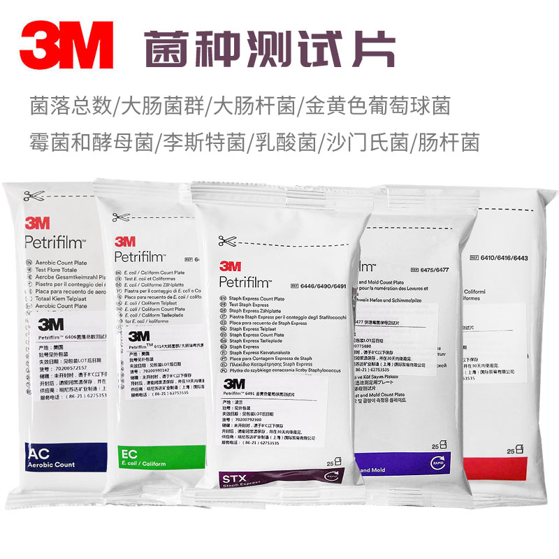 產品詳細介紹 美國3M PetrifilmTM微生物測試片 訂貨號 原始型號 規 格 參 數 S3E006 6406 菌落總數測試片,50片/包,20包/箱 S3E007 6416 大腸菌群測試片,25片/包,20包/箱 S3E008 6414 大腸桿菌/大腸菌群測試片,25片/包,20包/箱 S3E009 6491 金黃色葡萄球菌測試片,25片/包,20包/箱 S3E012 6417 酵母/霉菌測試片,25片/包,20包/箱 S3E017 6493 金黃色葡萄球菌快速確認反映片,20片/包,5包/箱 S3E024 X010 20cm2標準壓板(菌落總數及大腸菌群) S3E025 6425 扁平壓板,適用于金葡菌、沙門氏菌、霉菌的檢測 S3E026 6481 壓板,適用于高靈敏度大腸菌群(5ml型) S3E027 6498 壓板,適用于李斯特菌環境監測片壓板 S3A001 8331 密封夾123x155mm,ABS材質,1/包 更多規格請垂詢 產品描述 · 生產效率的極大提高,使用3M PetrifilmTM, 可以提高實驗室工作效率118%以上。 · 標準化的測試方法品質穩定的快速測試片克服了傳統的測試方法存在的由于使用不同批次的培養基 不同的配制條件,不同配制人員而導致的差異性。 · 國際化的認證體系 3M快速測試的方法得到包括AOAC,AFNOR在內的機構的認證,在全球 許多國家也已獲得官方機構的正式批準,從而可以確保檢測結果的可靠性和在世界各地的廣泛認可 · 快速得到檢測結果 對比傳統的測試方法,3M快速測試片縮短檢測時間,使您在更短的時間內獲得 樣品的測試結果,能更加迅速地采取有效的措施解決發現的問題。 · 儲存條件: 1、未開封時,冷藏于2-8℃。并在保存期限前使用完。 2、開封后,將封口以膠帶封緊,儲放于21℃/濕度50%以下,并于一個月內完成。 |