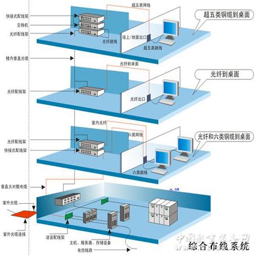 垂直干線子系統(tǒng) 目的是實現計算機設備、程控交換機(PBX)、控制中心與各管理子系統(tǒng)間的連接,是建筑物干線電纜的路由。該子系統(tǒng)通常是兩個單元之間,特別是在位于中央點的公共系統(tǒng)設備處提供多個線路設施。系統(tǒng)由建筑物內所有的垂直干線多對數電纜及相關支撐硬件組成,以提供設備間總配線架與干線接線間樓層配線架之間的干線路由。常用介質是大對數雙絞線電纜和光纜。 干線的通道包括開放型和封閉型兩種。前者是指從建筑物的地下室到其樓頂的一個開放空間,后者是一連串的上下對齊的布線間,每層各有一間,電纜利用電纜孔或是電纜井穿過接線間的地板,由于開放型通道沒有被任何樓板所隔開,因此為施工帶來了很大的麻煩,一般不采用。 設備室子系統(tǒng) 本子系統(tǒng)主要是由設備間中的電纜、連接器和有關的支撐硬件組成,作用是將計算機、PBX、攝像頭、監(jiān)視器等弱電設備互連起來并連接到主配線架上。設備包括計算機系統(tǒng)、網絡集線器(Hub)、網絡交換機(Switch)、程控交換機(PBX)、音響輸出設備、閉路電視控制裝置和報警控制中心等。 建筑群干線子系統(tǒng)圖 該子系統(tǒng)將一個建筑物的電纜延伸到建筑群的另外一些建筑物中的通信設備和裝置上,是結構化布線系統(tǒng)的一部分,支持提供樓群之間通信所需的硬件。它由電纜、光纜和入樓處的過流過壓電氣保護設備等相關硬件組成,常用介質是光纜。 建筑群子系統(tǒng)布線有以下三種方式: 地下管道敷設方式:在任何時候都可以敷設電纜,且電纜的敷設和擴充都十分方便,它能保持建筑物外貌與表面的整潔,能提供最好的機械保護。它的缺點是要挖通溝道,成本比較高。 直埋溝內敷設方式:能保持建筑物與道路表面的整齊,擴充和更換不方便,而且給線纜提供的機械保護不如地下管道敷設方式,初次投資成本比較低。 架空方式:如果建筑物之間本來有電線桿,則投資成本是最低的,但它不能提供任何機械保護,因此安全性能較差,同時也會影響建筑物外觀的美觀性。 |