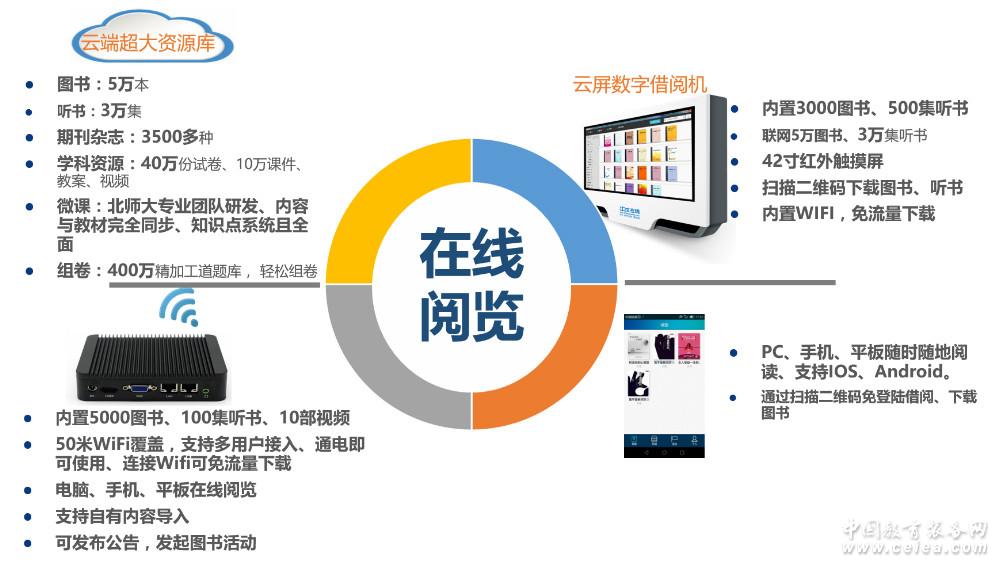 智慧課堂教學(xué)系統(tǒng)提供的在線閱覽系統(tǒng),在云端超大資源庫(kù)和云屏數(shù)字借閱機(jī)的硬件與軟件相配合下為學(xué)生提供各種書(shū)籍、期刊、課件、試卷、視頻等等課外輔助學(xué)習(xí)內(nèi)容,方便學(xué)生在課后查缺補(bǔ)漏。5萬(wàn)本書(shū)籍;3萬(wàn)集聽(tīng)書(shū);3000種期刊;40萬(wàn)份試卷、課件、教案;50萬(wàn)分鐘視頻;名師微課,科學(xué)權(quán)威;動(dòng)漫課堂,寓教于樂(lè);400萬(wàn)精加工道題庫(kù), 輕松組卷;配備賬號(hào),任一電腦均可使用讓學(xué)生充分利用課余時(shí)間提高學(xué)習(xí)成績(jī)