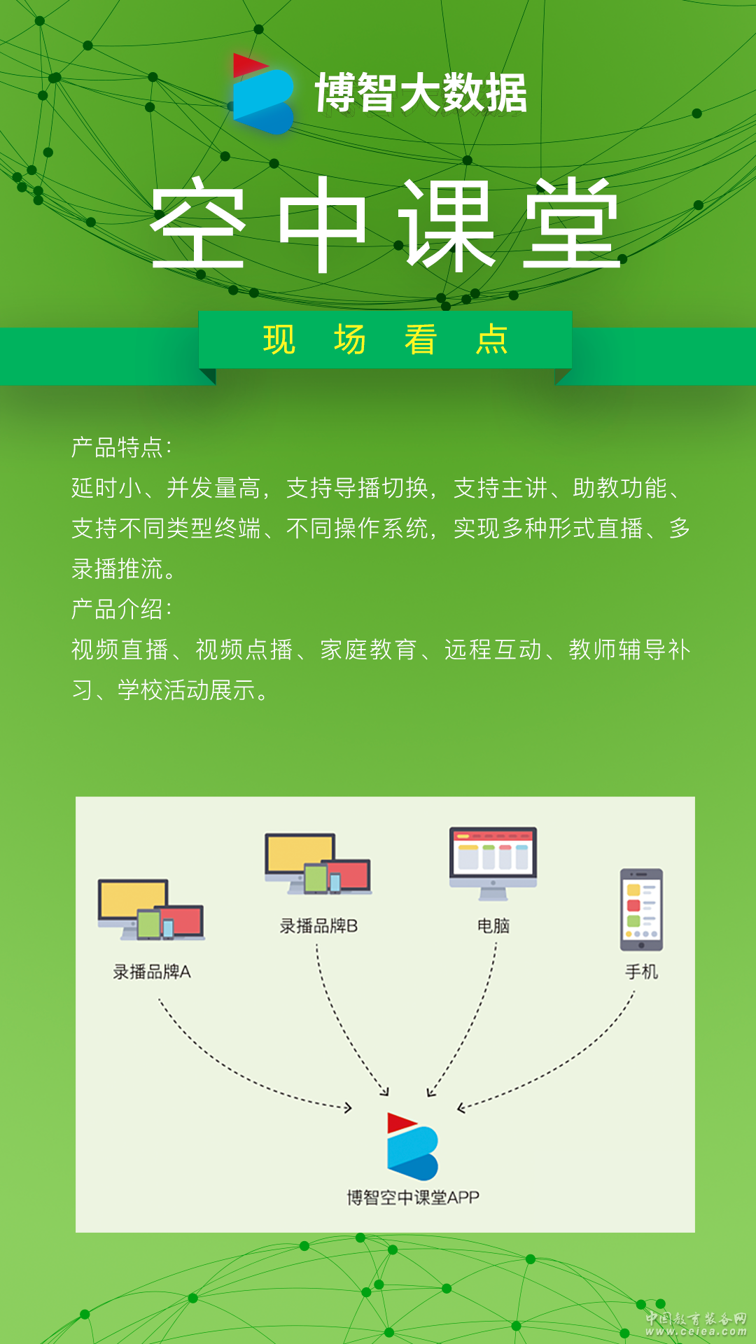 產品詳細介紹博智空中課堂通過rtmp標準協議,實現多錄播推流,支持視頻資源目錄自定義、客戶端支持局域網大規模直播無延遲、支持8錄視頻通過軟件導播切換,支持主講、助教功能。可以通過手機、電腦、攝像頭直播推流、實現多種形式直播。