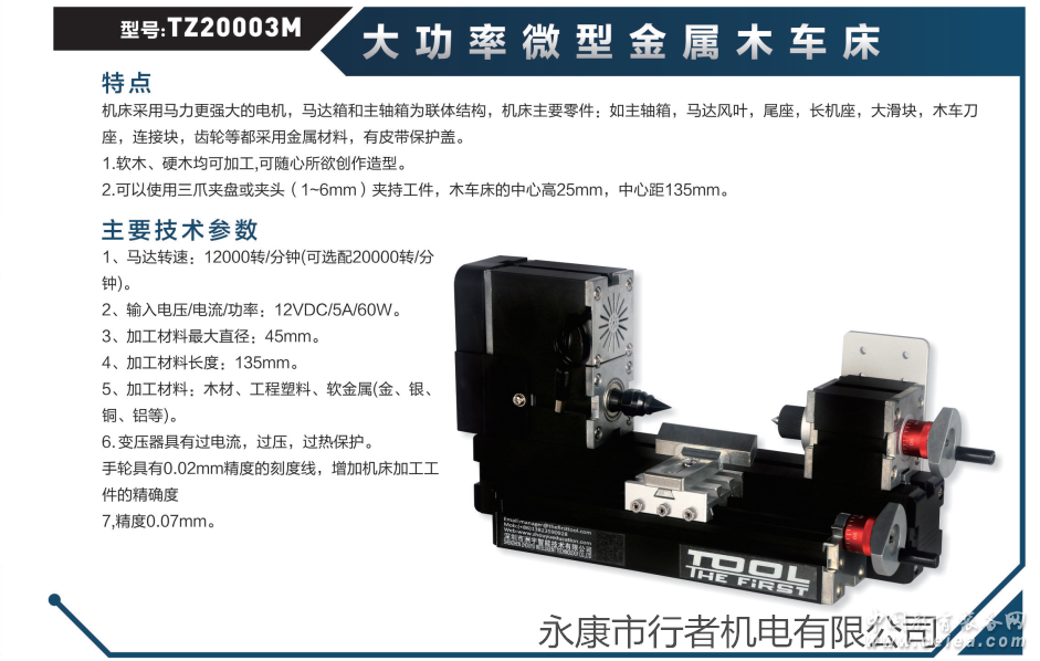 產品詳細介紹木車床特點:機床采用馬力更強大的電機,馬達箱和主軸箱為聯體結構,機床主要零件:如主軸箱,馬達風葉,尾座,長機座,大滑塊,木車刀座,連接塊,齒輪等都采用金屬材料,有皮帶保護蓋。 1.軟木、硬木均可加工,可隨心所欲創作造型。 2.可以使用三爪夾盤或夾頭(1~6mm)夾持工件,木車床的中心高25mm,中心距135mm。 技術參數: 1、馬達轉速:12000轉/分鐘(可選配20000轉/分鐘)。 2、輸入電壓/電流/功率:12VDC/5A/60W。 3、加工材料最大直徑:45mm。 4、加工材料長度:135mm。 5、加工材料:木材、工程塑料、軟金屬(金、銀、銅、鋁等)。 6. 變壓器具有過電流,過壓,過熱保護。 手輪具有0.02mm精度的刻度線,增加機床加工工件的精確度 7,精度0.07mm。 |