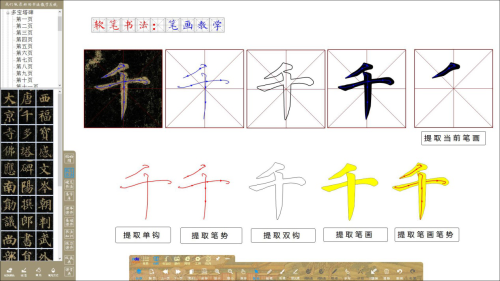 針對需要講解的單字筆畫,可分別提取單鉤、雙鉤、筆畫、筆勢、筆畫筆勢、單字當前筆畫、單字全部筆畫,從不同側重點講解;碑帖單字筆畫可一鍵轉換為原帖摹寫、單鉤摹寫、雙鉤摹寫、原字摹寫四種摹寫教學方式,同時單字的每個筆畫配有摹寫動畫演示。