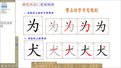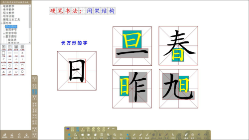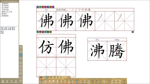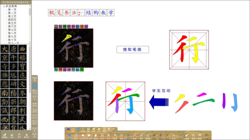 可提取單字中的任意筆畫進行講解,將筆畫進行輪廓化、填色,并可配合使用內置九宮格、米字格、回米格等書法專用圖形格進行字型結構講解;學生可以在電子白板/教學一體機上體會點畫與點畫之間的位置關系,進行自主組合搭配訓練,加強對字型結構的理解。